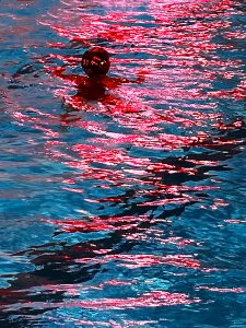 Attending my granddaughter’s water polo game at the same high school I graduated from, where I also played water polo brought forth a flood of memories. It was raining and cold out side, but that didn’t matter, the snack bar was open and they were serving hot chocolate and coffee. While capturing some action of the players I noticed the red lights from the score board reflecting in the water and the contrast of the blue water making striking abstract patterns on the water’s surface. After many captures I decided on this one with the most intriguing pattern. On a deeper level for me, this image contrasts the cold water with many warm memories.