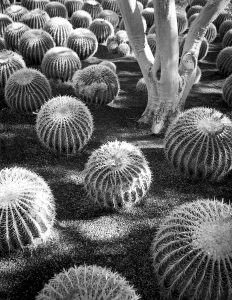 For as long as I can remember, the barrel cactus has been one of my favorites. Its shape and impenetrable exterior feel like the perfect adaptation of plant to environment. A large grouping of them, arranged in a uniform display, caught my eye, the repeating forms and dappled light offering exactly the visual direction I was hoping to explore today.